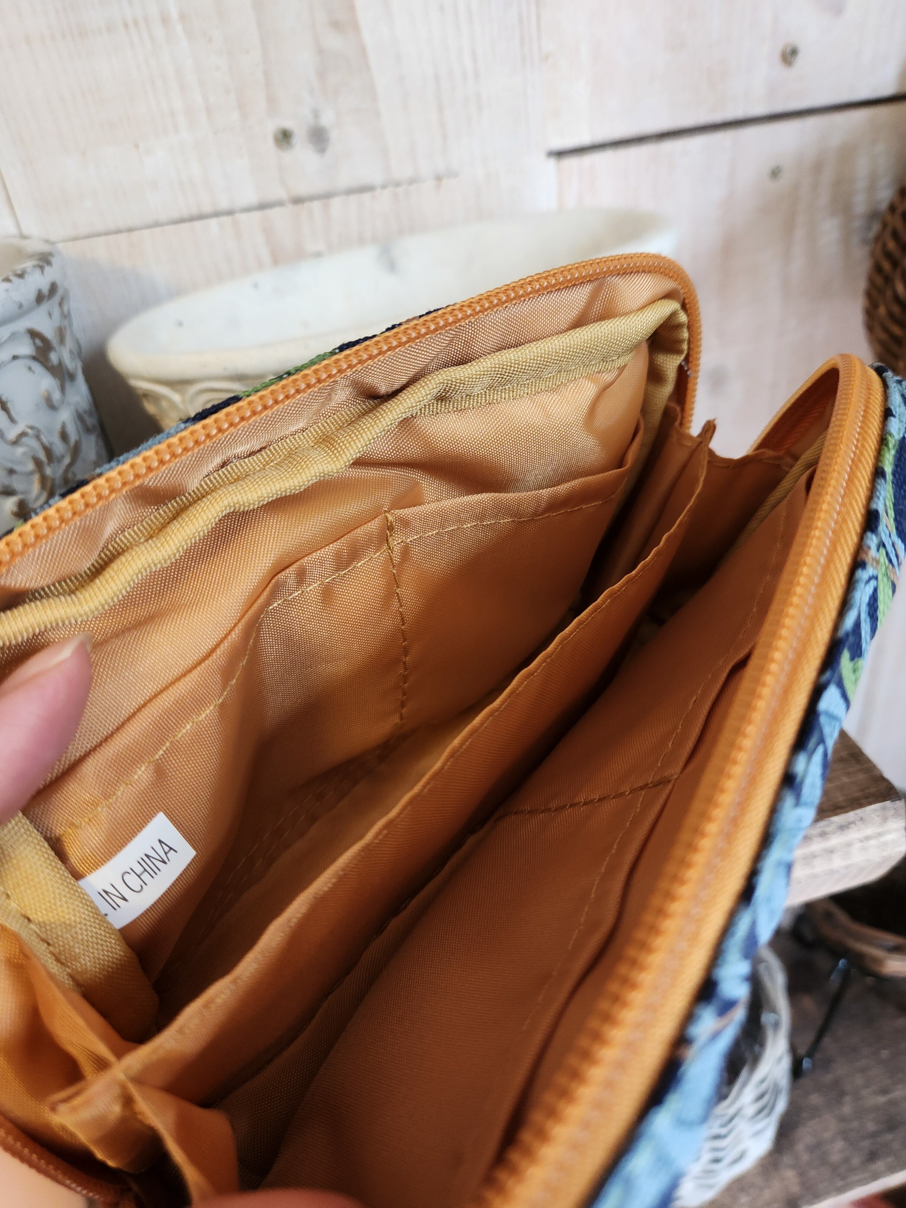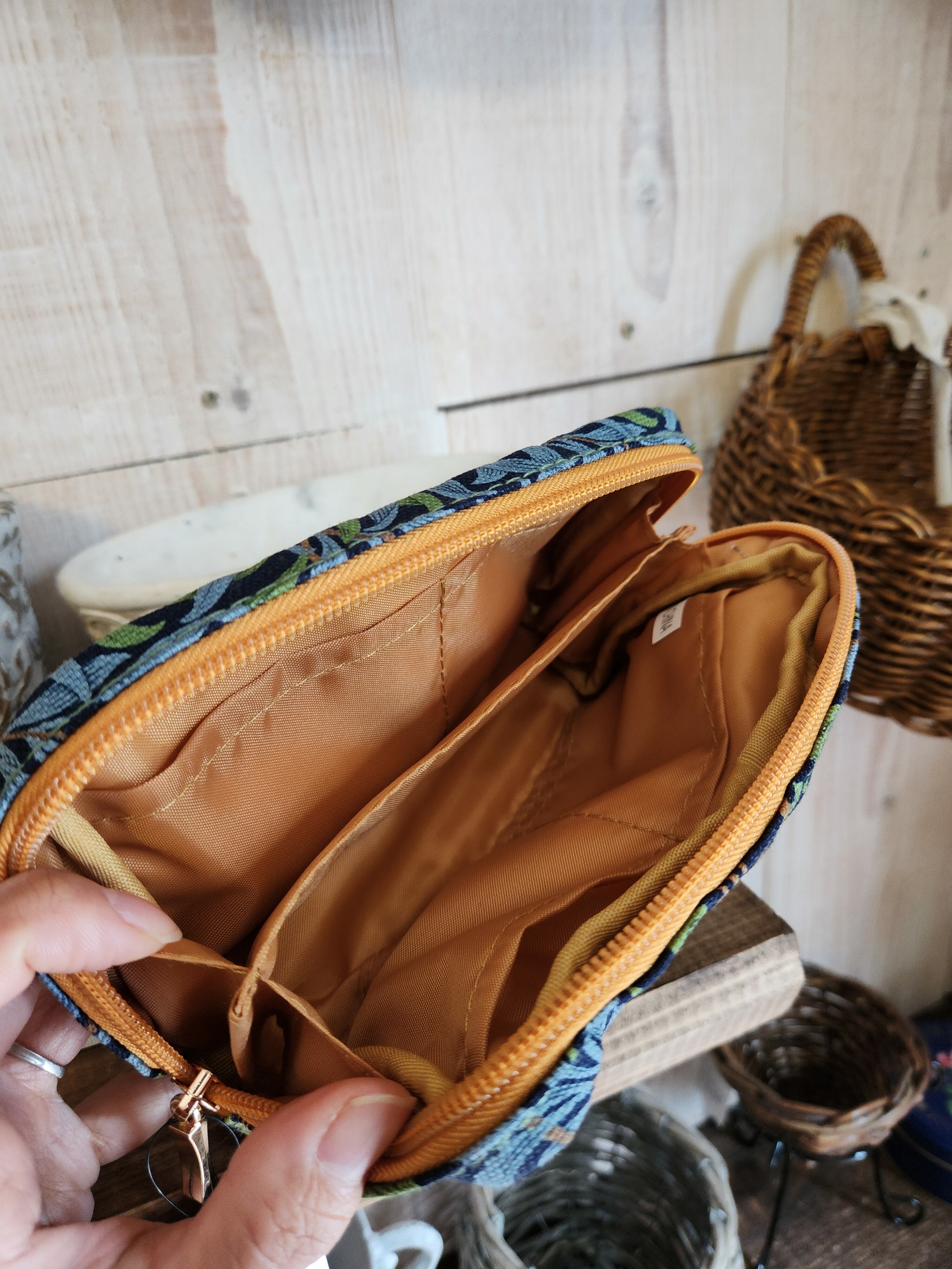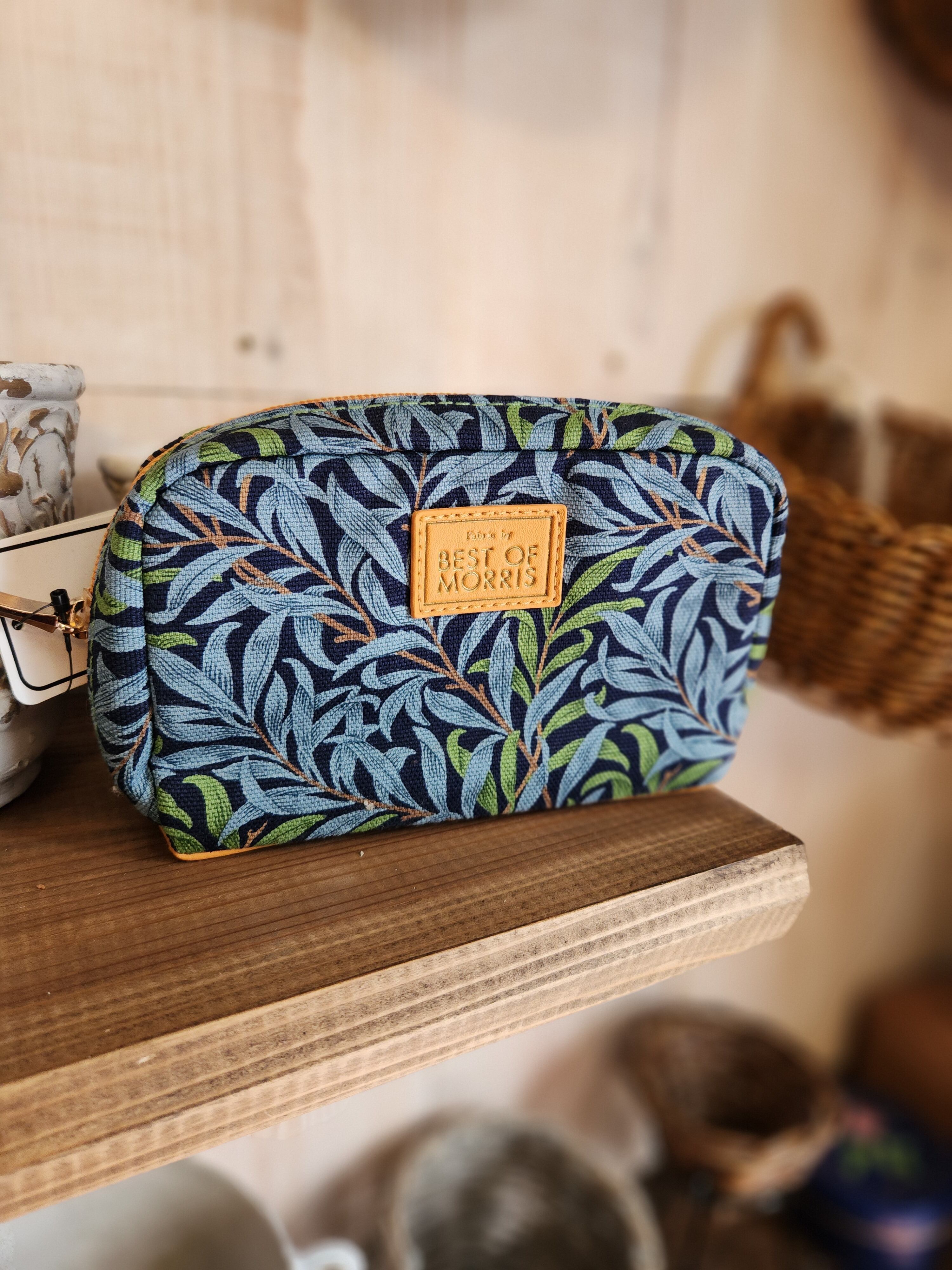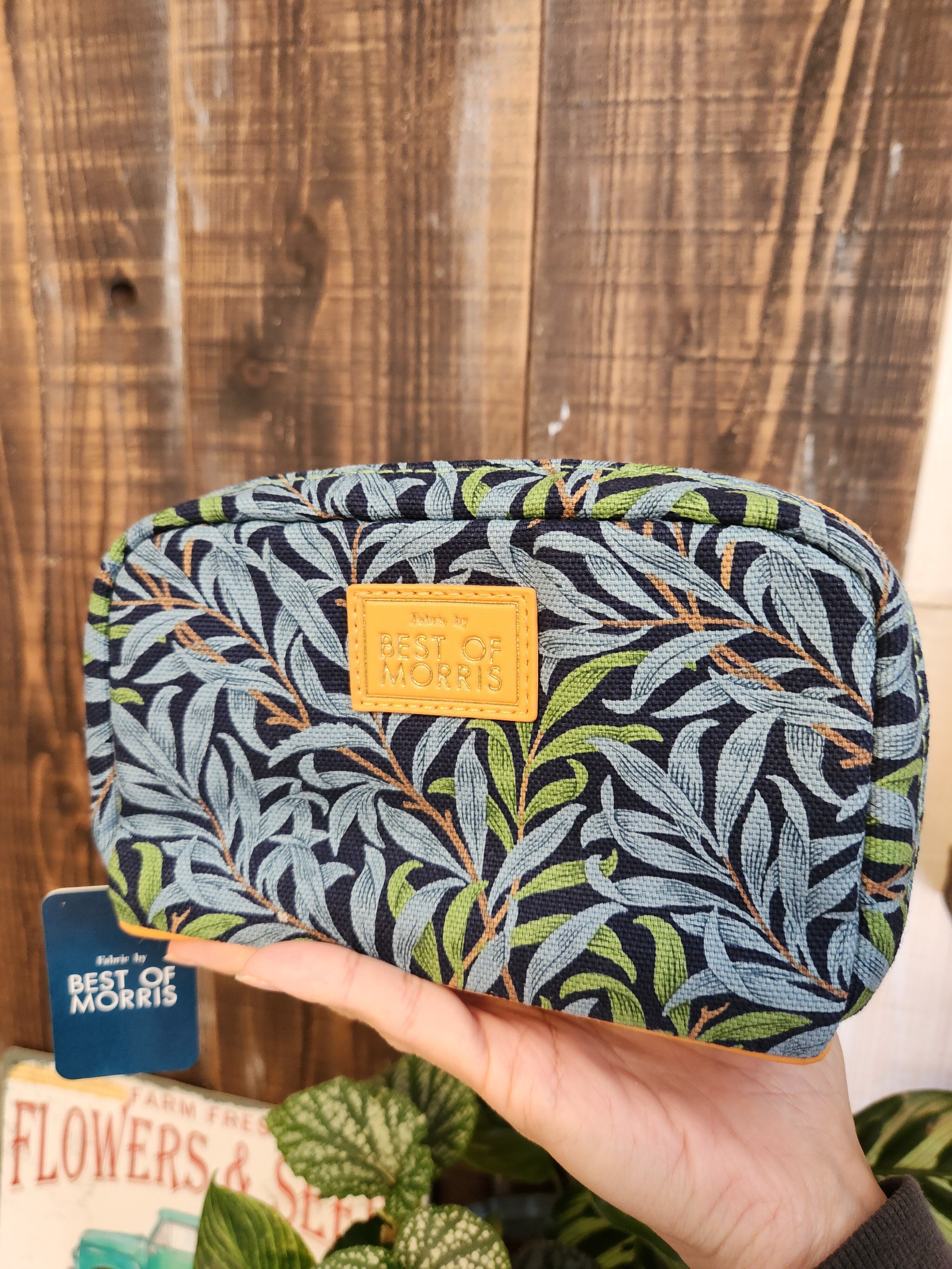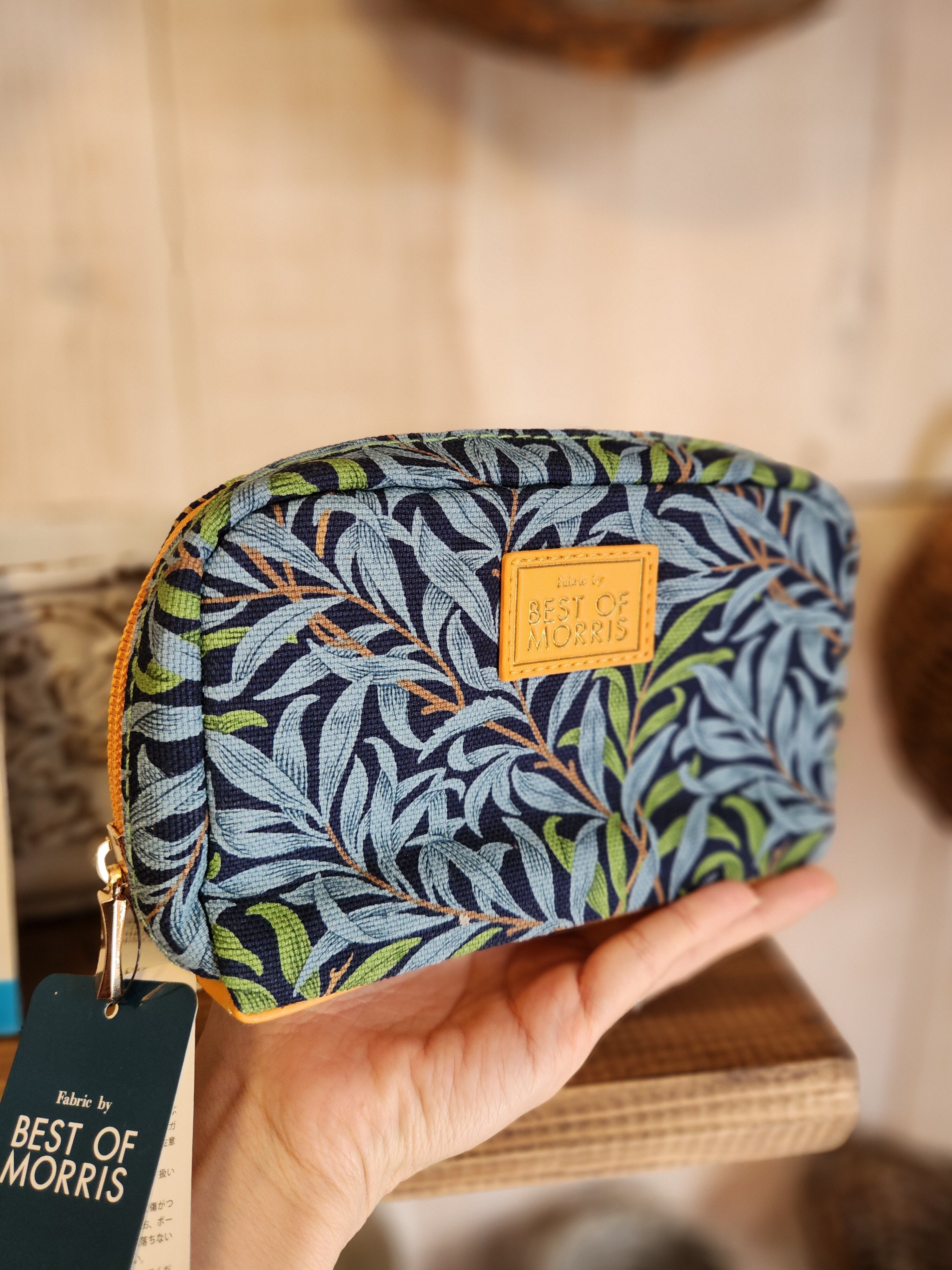 BEST Oᖴ MORRISのポーチです。紺色ベースに深みのある水色とグリーンであしらわれた植物柄。植物好きには堪らない。植物の息吹を、持ち歩きながら感じられる、そんな商品です。